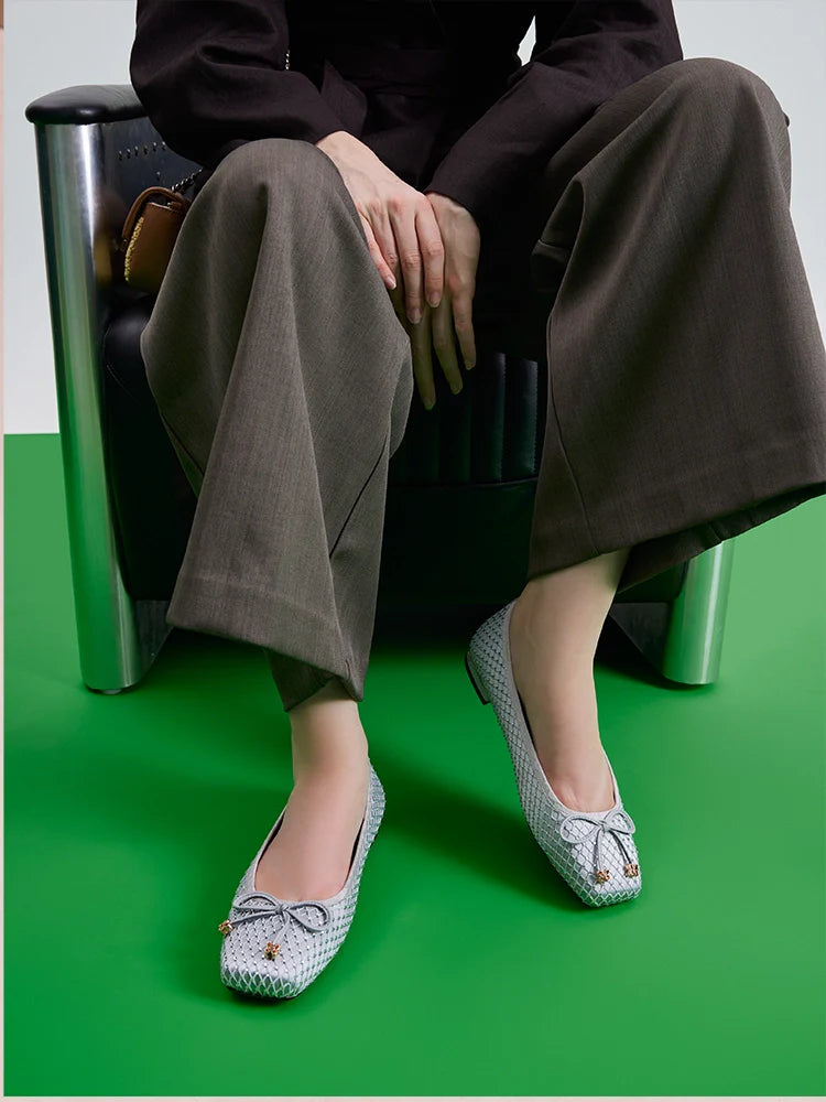 Tory presents a captivating interplay of texture and refined detailing, showcasing a luxurious faux silk upper adorned with a meticulously crafted grid of shimmering crystals. The delicate bow at the front is accented with elegant hardware, offering an exquisite detail that enhances their timeless charm. Offered in soft grey and delicate pink, elevating every look with an aura of everlasting allure.