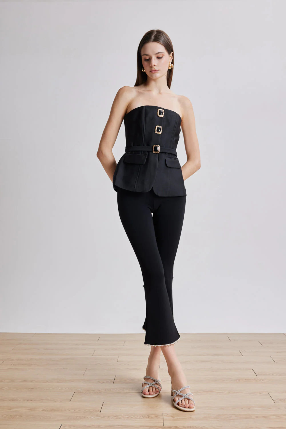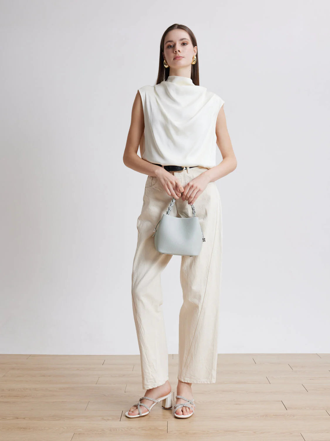Ema capturess the spirit of the season with sculptural glamour. Crystal-embellished knotted straps sit gracefully across the vamp, while the block heel offers modern stability. Radiant yet understated, they’re designed to elevate evening looks with a festive edge.