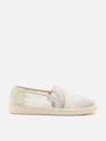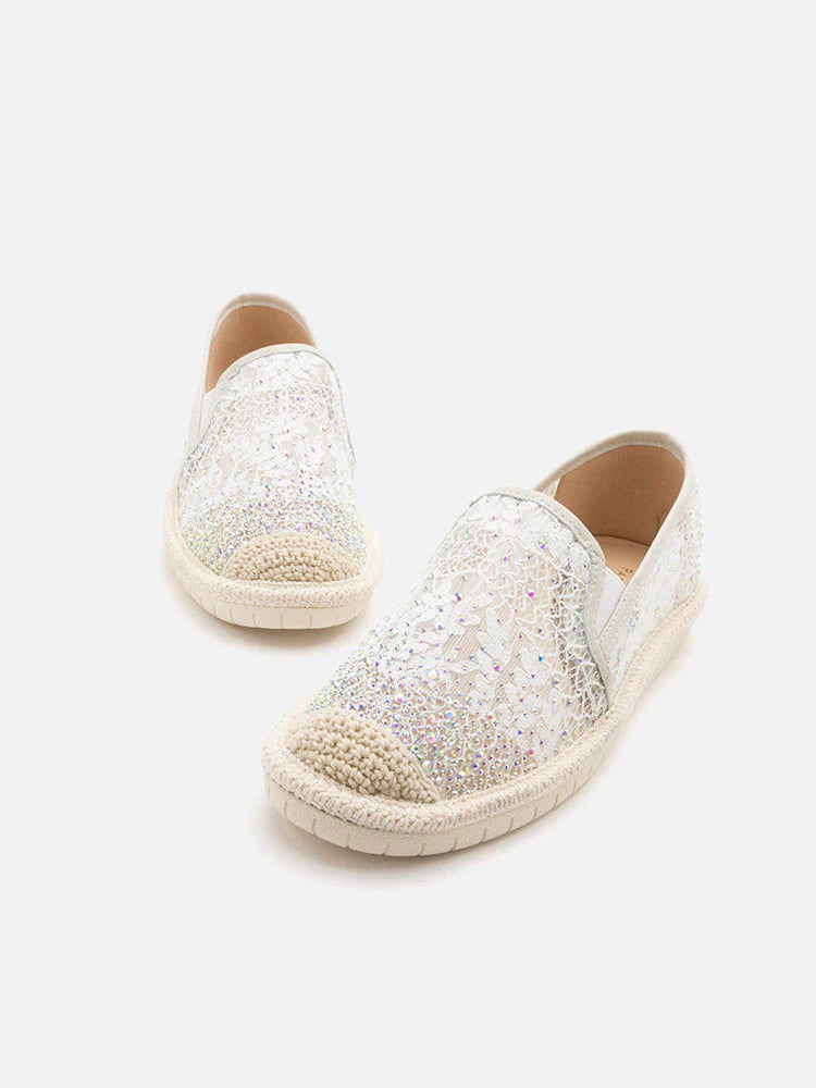 • Unveil the epitome of refined sophistication with Sabrina, blending the charm of traditional espadrilles with a touch of modern glamour through delicate crystal embellishments. As you slip into these luxurious shoes, you'll feel an immediate sense of comfort, thanks to their expertly designed construction. The soft, breathable fabric cradles your feet, making them an ideal choice for both casual gatherings and special occasions. With each step, you'll shimmer and shine, leaving a trail of elegance wherever you go.