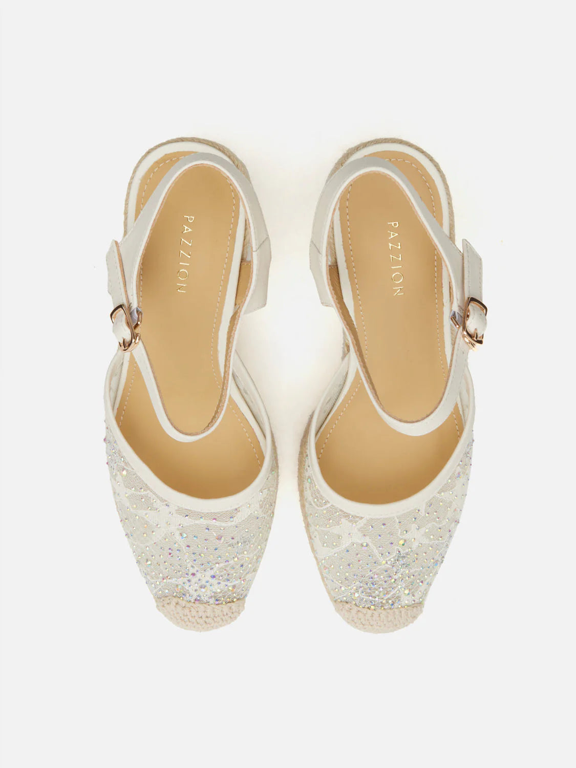 These wedges have a lace upper with sparkling crystals on the front for a subtle, elegant touch. The soft lambskin lining and insole keep your feet comfortable, while the 8.5cm jute-wrapped wedge adds gentle height with style.
